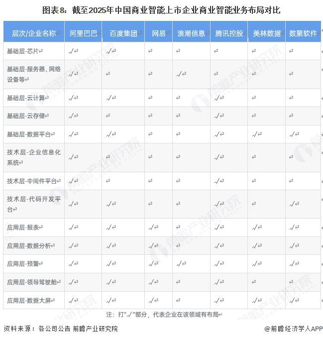 在 BI 相关的基础层、技术层、应用层中,阿里巴巴、腾讯控股覆盖最全面 ; 百度集团侧重基础层芯片与云计算、技术层代码开发及应用层核心功能 ; 网易聚焦应用层 ; 浪潮信息主攻基础层服务器与基础预警 ; 美林数据、数聚软件则以基础层数据平台、技术层部分能力及应用层核心功能为核心。