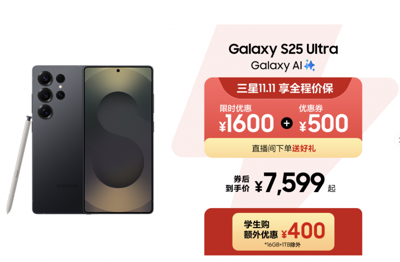 记忆会模糊,感受会褪色,三星Galaxy S25 Ultra能够让每一刻精彩都转化为可以永久珍藏、反复回味的高清记忆。如今正值三星11.11双11大促,用户购机可享受到全年力度最大的优惠,券后到手价仅7599元起,并且学生购机还可额外优惠400元。心动的用户快去三星商城下单,带上Galaxy S25 Ultra奔赴你的青春现场吧!
