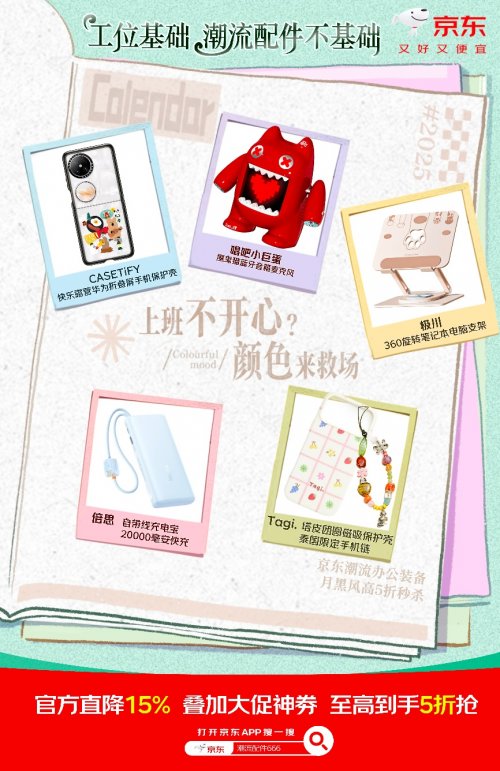 每天在工位上埋头苦干,堆积如山的工作与无形的压力如影随形。而这时,一件充满设计感的潮流配件,就像生活里的小确幸,能瞬间治愈疲惫的心情。CASETiFY快乐露营华为折叠屏手机壳,将户外闲趣带到指尖,每一次拿起手机都能成为放松。Tagi塔皮团圆磁吸壳+泰国限定手机链,异域风情为手机增添一抹别样色彩;唱吧小巨蛋魔鬼猫蓝牙麦克风,空闲时间随时能开启一场迷你演唱会,释放工作压力;极川360°旋转笔记本电脑支架,灵活调节屏幕角度,颈椎和视角都更自由;倍思20000毫安充电宝自带充电线,告别线材杂乱,轻松“满电”出门。