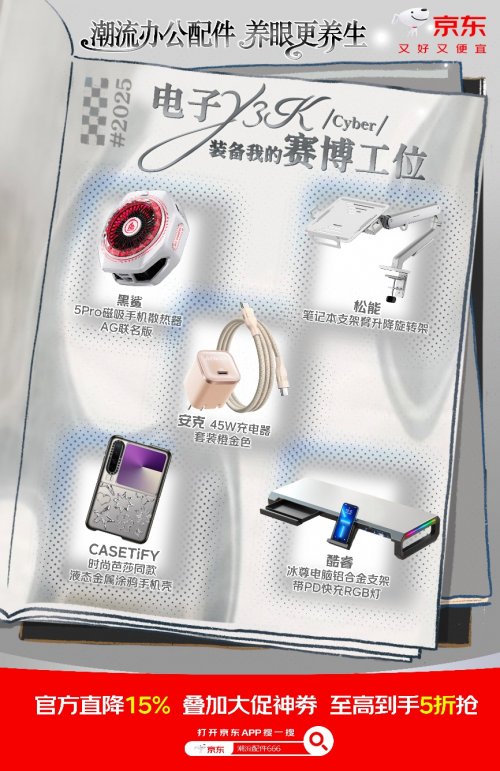 未来感与实用性兼备的电子Y3K工位,是不少潮人的追求。黑鲨5Pro磁吸手机散热器AG联名版,冷酷外观下确保高性能持久输出,游戏办公都不掉线。松能笔记本支架臂升降旋转架,悬停自由,节省宝贵桌面空间。安克45W充电器套装,小巧体积蕴含巨大能量,快速恢复设备状态。CASETiFY时尚芭莎同款液态金属涂鸦手机壳,金属质感与街头涂鸦碰撞,科技单品亦是潮流配饰。酷睿冰尊电脑铝合金支架,集成PD快充与RGB光效,氛围感与实用性拉满。