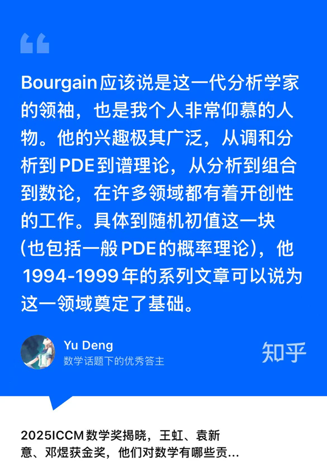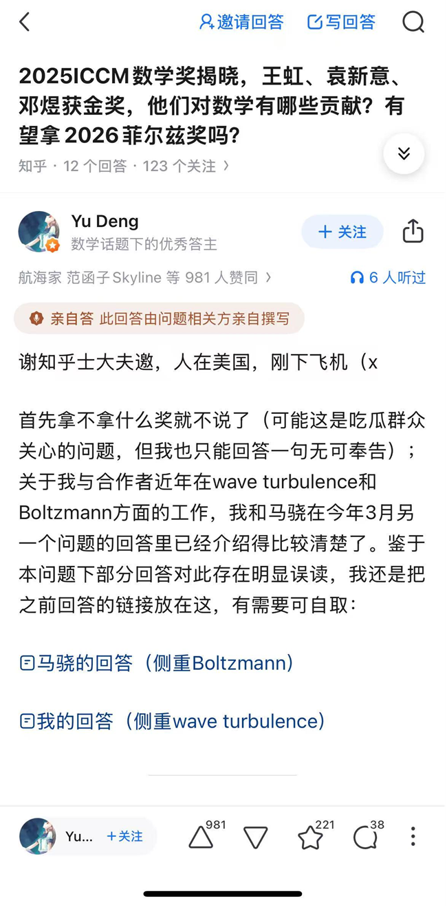 近日,第十届世界华人数学家大会(ICCM2025)金奖花落三位北大数院校友:王虹、邓煜和袁新意。作为获奖者之一,芝加哥大学教授邓煜作为数学领域优秀答主,在知乎亲自答,独家分享了其学术研究历程和成果。