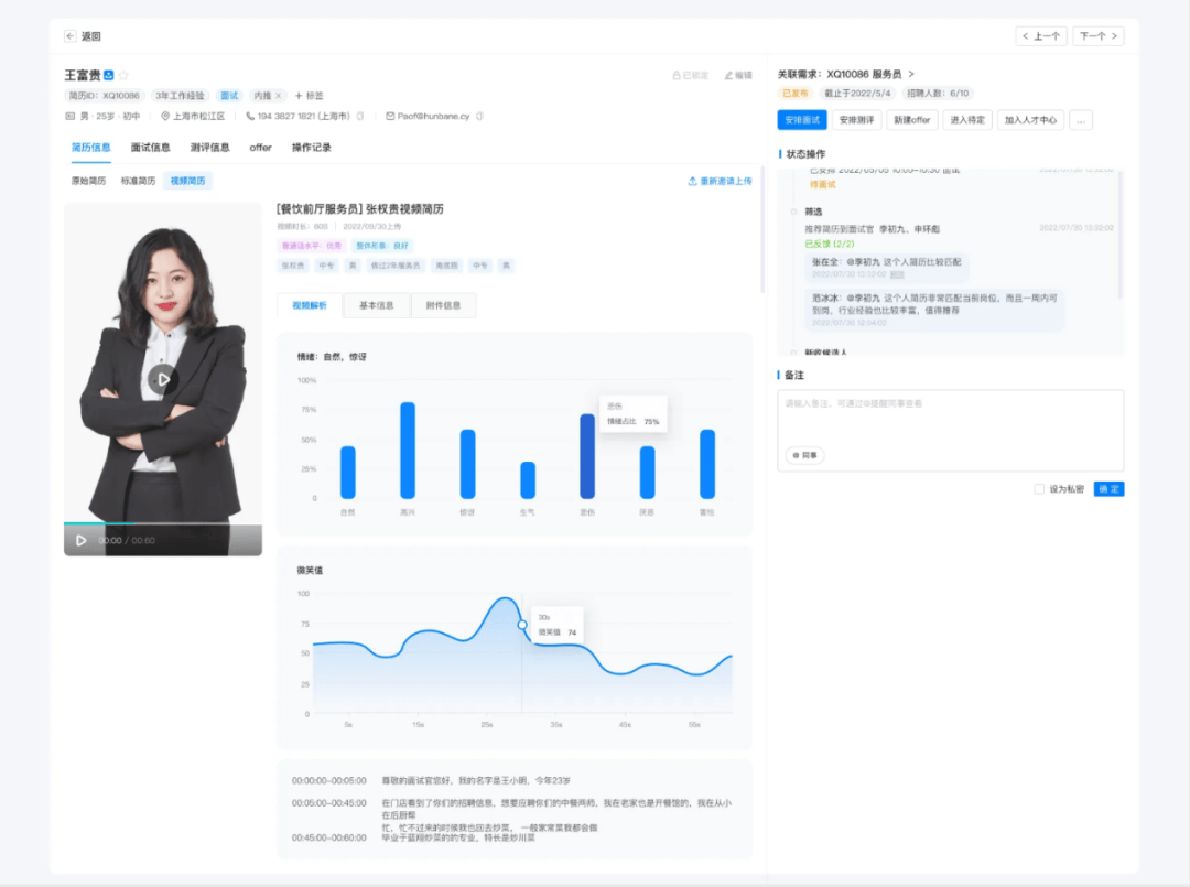 远程视频简历/面试:经候选人授权后,分析其在录制视频简历或远程面试中的求职意向度、抗压能力及岗位匹配度,为HR初筛与辅助决策提供精准依据;