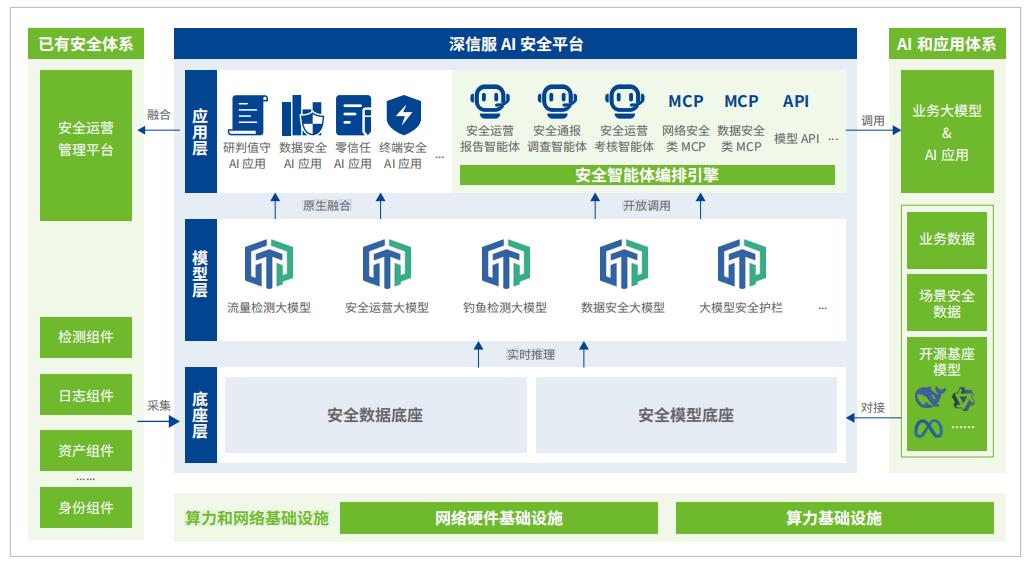 深信服通过AI安全平台建立起面向「AI+安全」时代的全域安全智能中枢。平台以统一“安全数据和模型底座”为核心,原生集成流量检测、安全运营、钓鱼防护、 数据安全等场景化安全大模型,实现从“AI增强单点技术”到“AI赋能安全体系”的渐进式升级,帮助用户构建智能融合、化繁为简、实战有效的“AI安全能力池”。