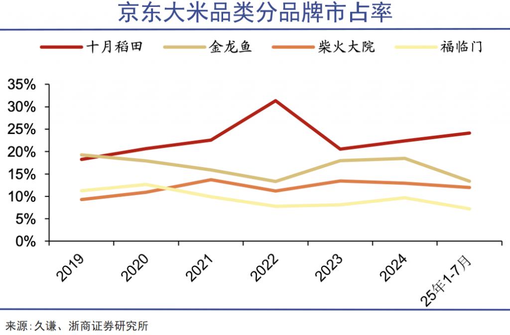 此后借助直播带货、达人种草和内容营销,十月稻田逐渐成为优质大米的网红顶流。当前,十月稻田在优质大米、东北大米的市占率均为第一。