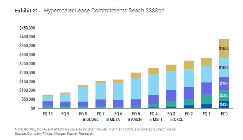 这种模式允许科技巨头们加速产能扩张、管理流动性并锁定未来的选择权。更值得关注的是,报告数据显示,这些公司已披露了价值高达 3880 亿美元的 " 已签署但尚未开始 " 的租赁合同。
