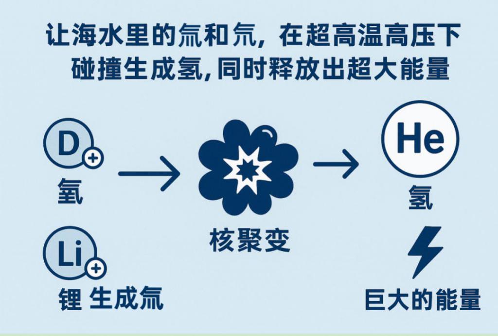 咋整?只有搞核聚变。它的燃料是氘(D)和氚(T)——氚可由锂生成,该元素在地壳里丰富得很;氘来自海水,海水也多的是,1 升海水提取出的氘,理论上可以释放相当于 300 升汽油的能量,而全球海洋中的氘,至少够人类使用数十亿年。