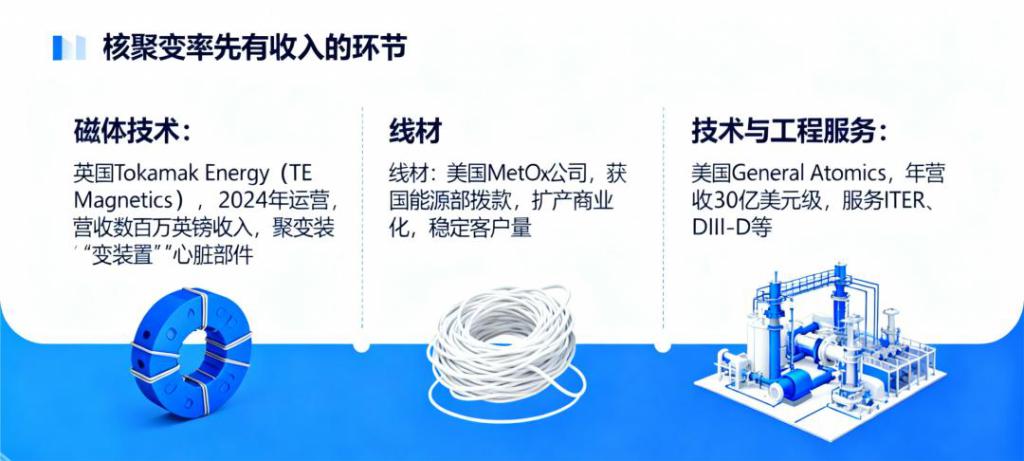 虽然距离 " 卖电 " 还很远,但是,这并不代表没有赚钱机会。事实是:不少公司已经在核聚变上有收入了,尤其是新材料、核心零部件环节。