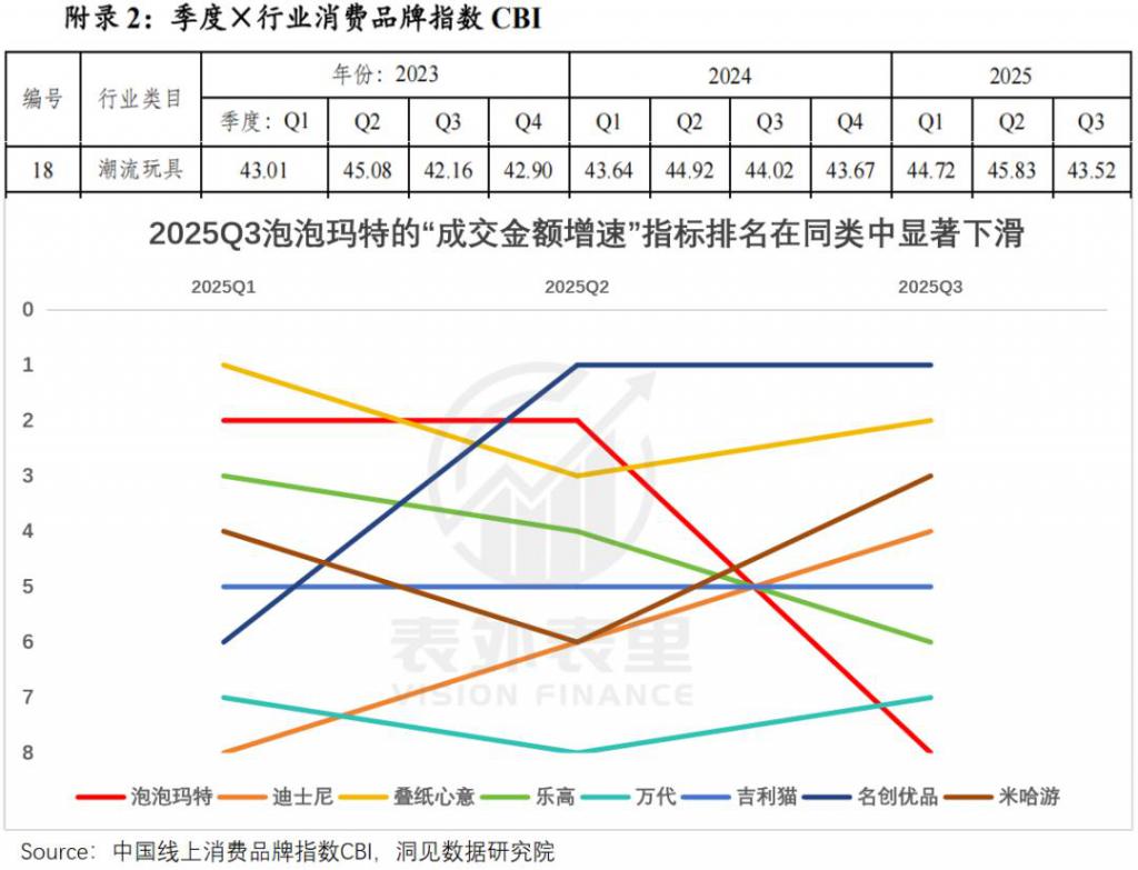 最新的 CBI 指数显示,潮流玩具行业 CBI 指数同比环比均下滑,其中泡泡玛特 " 成交金额增速 " 排名下降明显。