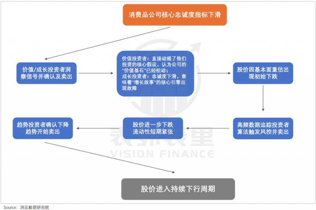 这些指标指向的,是顾客忠诚度的下滑。而在消费品行业,忠诚度是观察消费品公司 " 护城河 " 深浅、商业模式壁垒的关键先行指标,一旦不及预期,各类投资者都将出现不同层面的逻辑破坏,进而集体撤退。