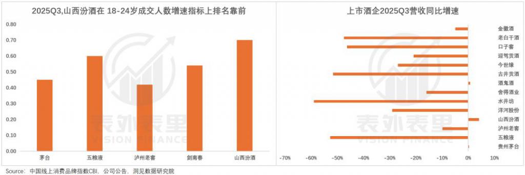 新喝法、新场景、新营销全面推动下,品牌拉进了与年轻群体的距离,汾酒、剑南春三季度的 CBI 指数中,18-29 岁成交金额增速领先。这也直接助推业绩逆势增长,山西汾酒是 2025Q3 唯三实现营收增长的上市酒企。