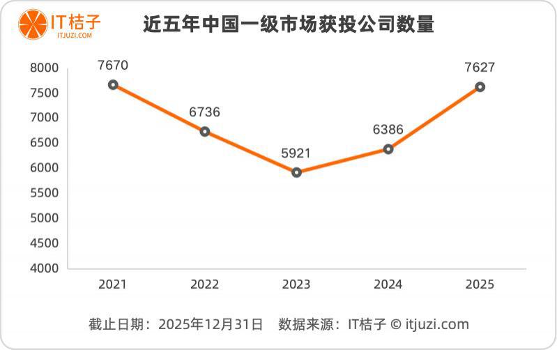 2025 年共有 7627 家公司获得投资,比 2024 年的 6386 家增加 1241 家,增幅达到 19.4%。