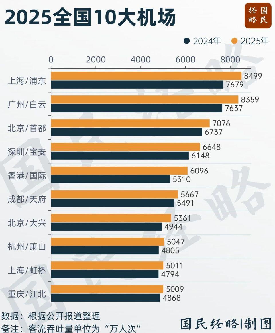 总体来看,全国 10 大机场的门槛,已从 2019 年的 4000 万人次,提升到 2025 年的 5000 万人次。