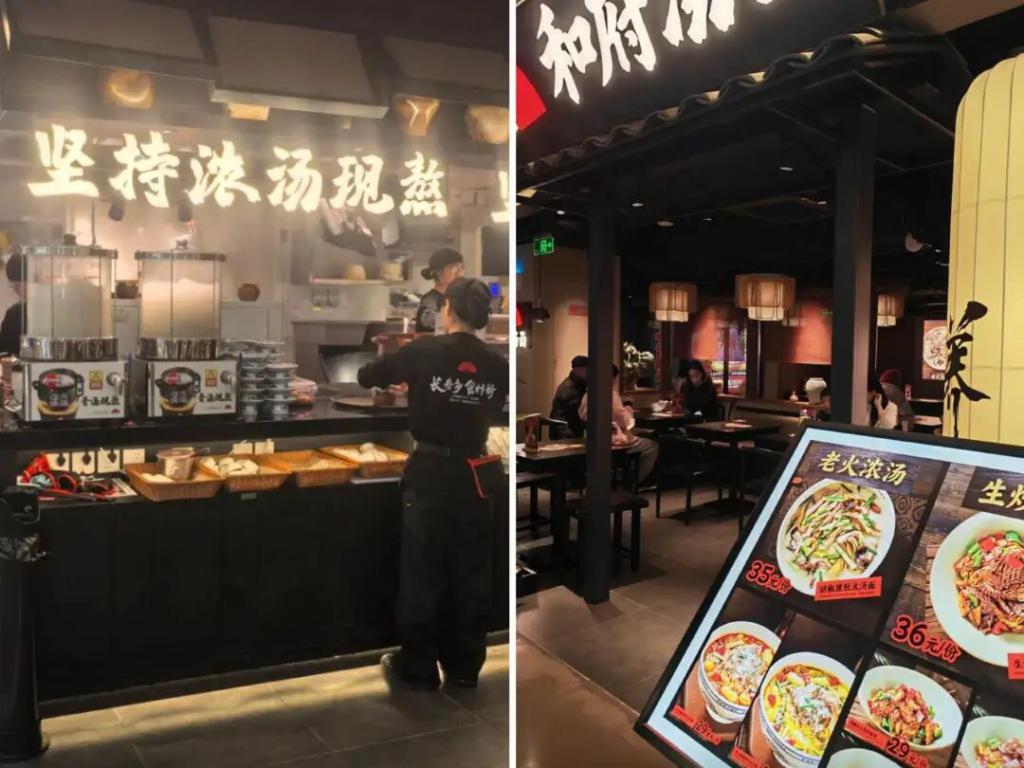 和府捞面的副牌几乎没有在市场激起太大水花,比如火锅、小酒馆,小排档、拉面、咖啡、拌饭等,不过内参君发现,和府捞面旗下子品牌和府汤面在上海有两家新店,人均 30-40 元,主打 " 浓汤现熬和浇头现炒 ",实际上该品牌在一年前就已经出现且主打 " 面 + 牛排 ",而由于牛排品类的加入,客单相对较高,一度达到人均近 50 元,而今向着刚需和性价比完成了一次转型。