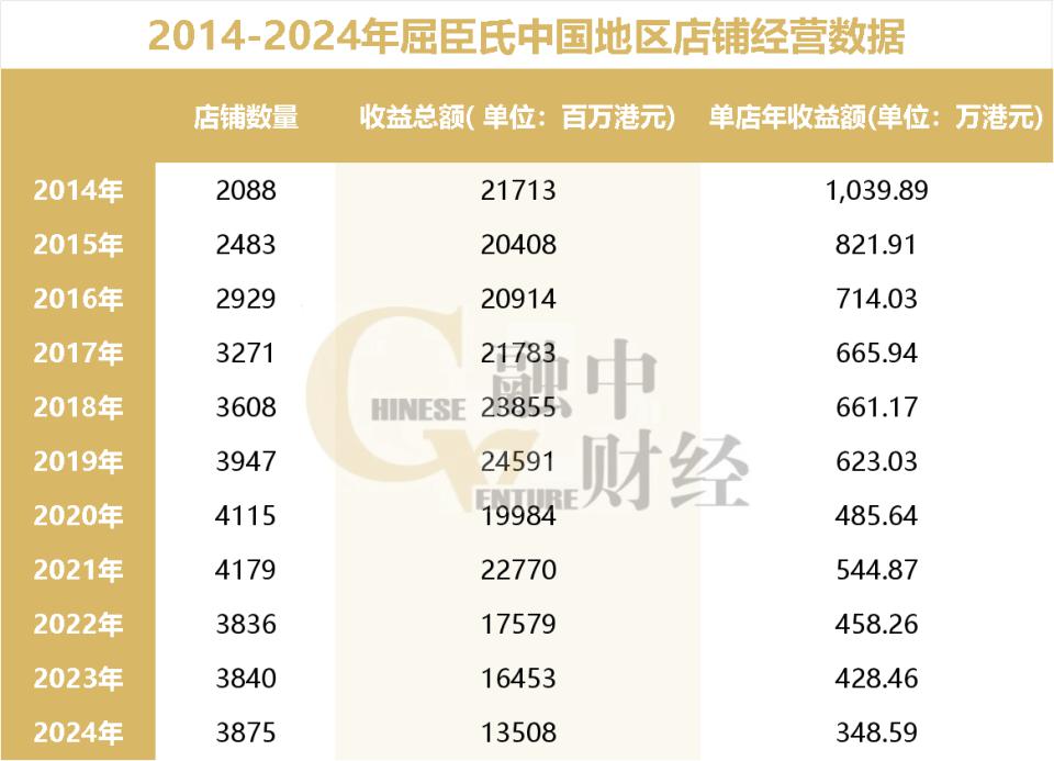 但盲目扩张导致单店效益断崖式下滑,如下图所示,2014 年单店年收益为 1039.89 万港元,2020 年腰斩至 485.64 万港元,2024 年进一步跌至 348.59 万港元。