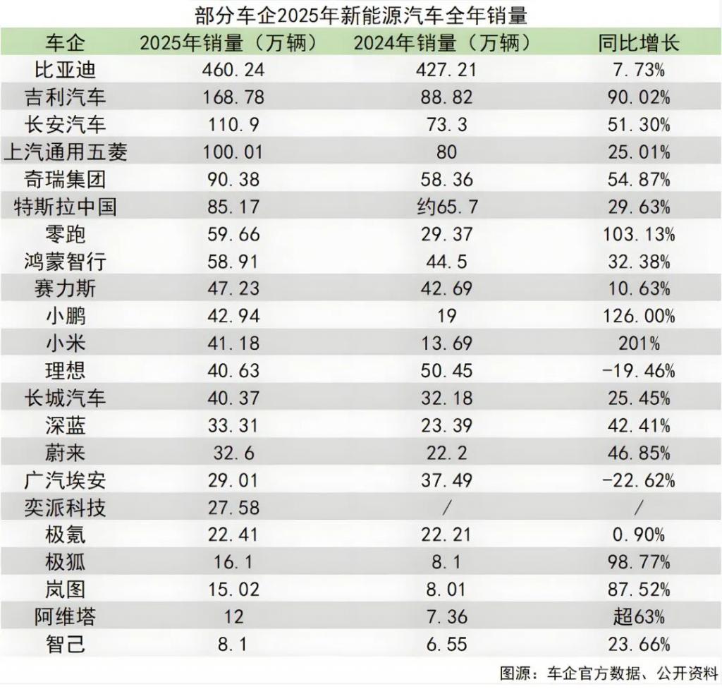 比亚迪遥遥领先,以 460.24 万辆的全年销量蝉联冠军,其中纯电车型销量 225.7 万辆,超越特斯拉成为全球纯电冠军。其高端品牌矩阵也表现亮眼:方程豹系列全年销量 23.46 万辆,同比暴涨 316%,腾势品牌也持续收割高端市场份额。