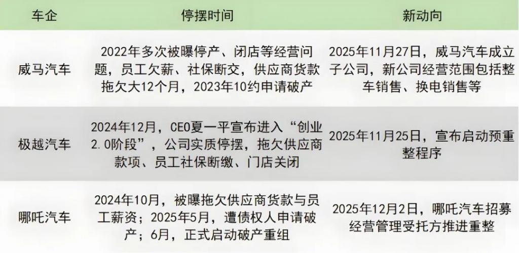 此外,威马、极越、哪吒等陷入困境的车企,还没彻底退场,正在积极通过重整、成立新公司等方式寻求 " 重生 "。
