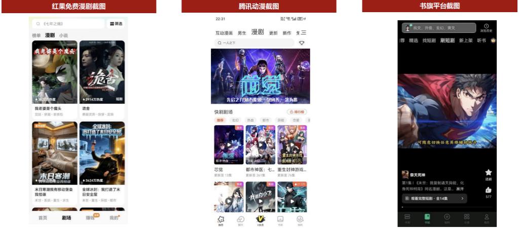 微信生态同样在放量。2025 年微信生态漫剧上架数量同比增长 3380%。据浙商证券引用七麦数据,近 30 天红果免费漫剧日均下载约 89 万次,书旗约 20 万次,腾讯动漫约 11 万次。