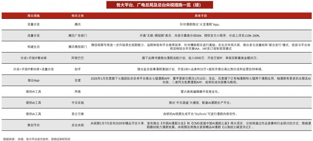 自 2025 年 10 月以来,字节、快手、腾讯视频、芒果、爱奇艺等密集推出扶持政策,组合拳主要落在分成、AI 工具、开放 IP 素材库与流量分发四类资源上。