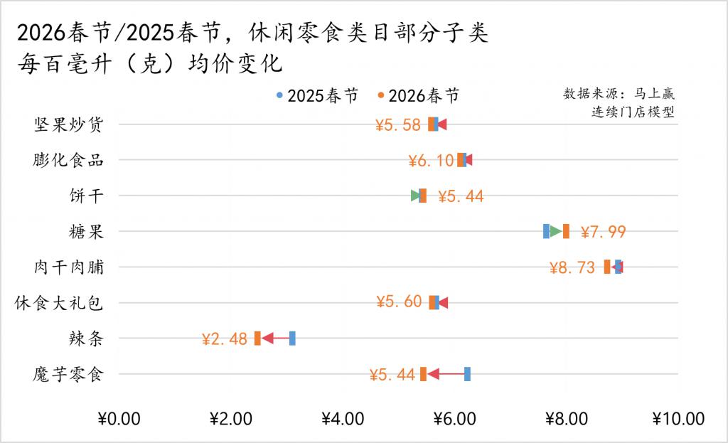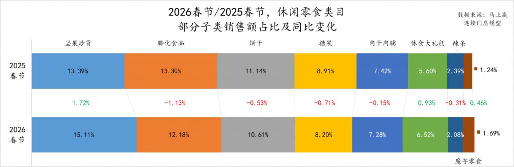 在上述大类中,我们进一步精选了休闲零食、饮料、酒、乳制品、调味品、方便速食、速冻食品几个大类,通过类目内不同子类目的占比变化、各子类销售额同比增速、单位克重下均价,以及TOP份额增长集团变化等,来观察2026年春节这些类目正在发生何种趋势性的变化。