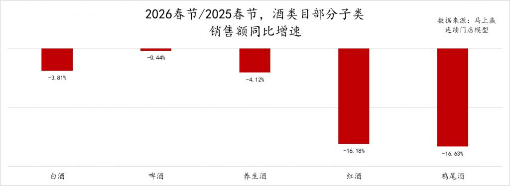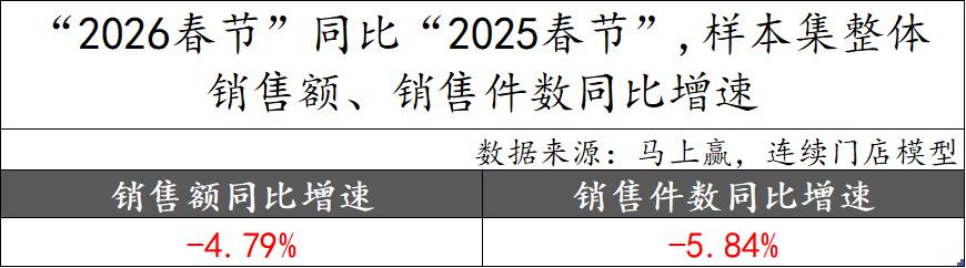 马上赢也曾在2025年、2024年都基于当年春节与前一年春节的情况进行过研究。在2025年春节同比2024年春节,这一销售额同比数字大约下滑约7%;在再早一年的2024年春节同比2023年春节,这一数字大约同比下滑约10%左右。各年之间的数据因划定时间段、样本情况等原因并不完全有可比性,但从趋势上看,整体的下滑还是在收窄当中。