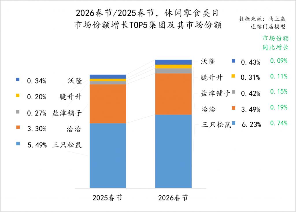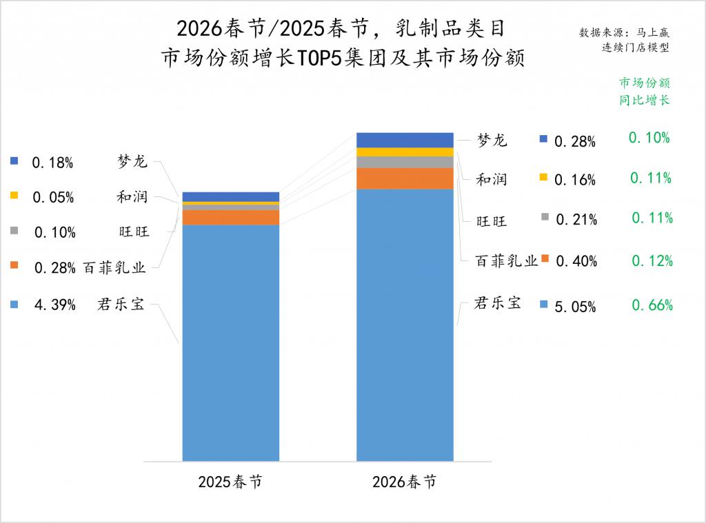 2026年春节同比2025年春节,乳制品大类中的市场份额同比增长TOP5集团分别是君乐宝、百菲乳业、旺旺、和润与梦龙。其中君乐宝集团在2025年受益于低温鲜奶、低温酸奶类目的增长,取得了较好的市场表现,马上赢也曾经在君乐宝集团赴港上市递表时进行过专题研究(图集丨君乐宝递表,专注低温的"乳业第三"),未来伴随着牛奶酸奶低温化浪潮,君乐宝在2026年或将有进一步的发展,值得持续关注。