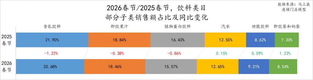 从销售额同比来看,即饮茶和奶茶、功能饮料类目销售额同比增长为正,其中即饮茶和奶茶销售额同比增速超过12%,为观察的饮料类目中销售额同比增速最高的子类。而含乳饮料、植物蛋白饮料的销售额同比下滑较为严重,2026春节同比2025春节销售额同比下滑均超过8%。