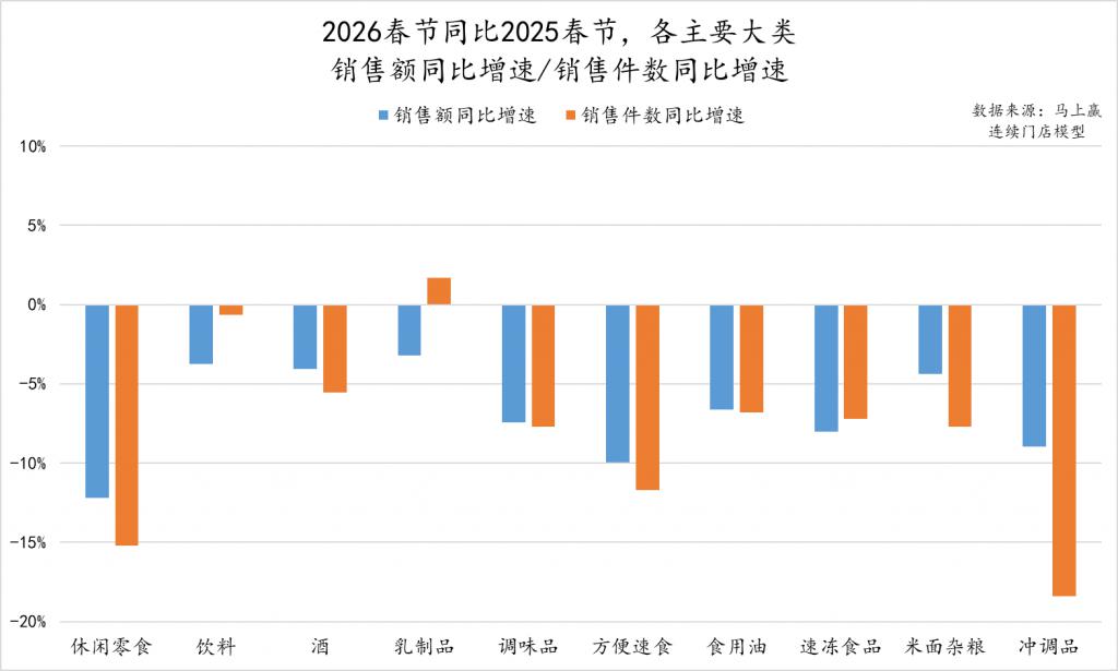 上看,休闲零食、方便速食、冲调大类首当其冲;调味品、食用油、速冻食品、米面杂粮位于中间地带;饮料、酒、乳制品的表现在这些大类中整体最好,不论是销售额同比增速还是销售件数同比增速,下滑幅度均在5%以内。特别值得一提的是,乳制品类目在过去的2024、2025两年整体压力都比较大,价格上、规模上都有体现,但在2026年春节,其表现整体较为亮眼,类目是否已经筑底、回升,值得进一步观察其在2026春节后的走势。