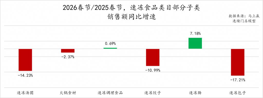 从价格变化来看,该部分类目在2026年春节同比2025年春节,均呈现出每百克均价同比下滑,其中速冻肠类目的价格下滑幅度最大。推测其原因,速冻肠类目近年来取得了较快的增长,越来越多的集团与品牌正在布局这一类目,从而让类目的竞争也变得愈发激烈,促销活动增加、市场策略也更加激进,也或许影响到了类目百克平均价格的稳定。