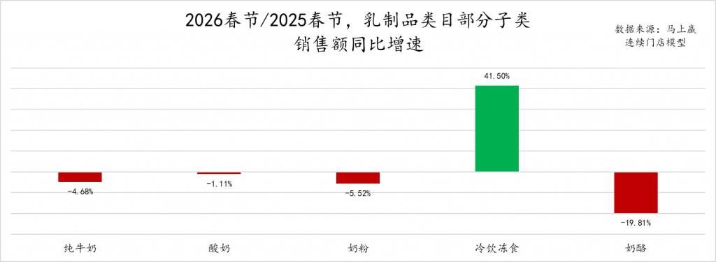 从乳制品的占比及占比同比变化上看,纯牛奶作为节礼中的首选其占比过半,但在2026春节同比2025年春节,占比有将近1%的下滑,或许可以说明部分消费者的节礼选择正在从纯牛奶中流出;占比同比下滑的类目还有奶粉、奶酪类目,其中奶酪在两年春节的占比约2.5%左右,其2026年春节占比同比2025年有接近0.5%的同比下滑,下滑较为显著。
