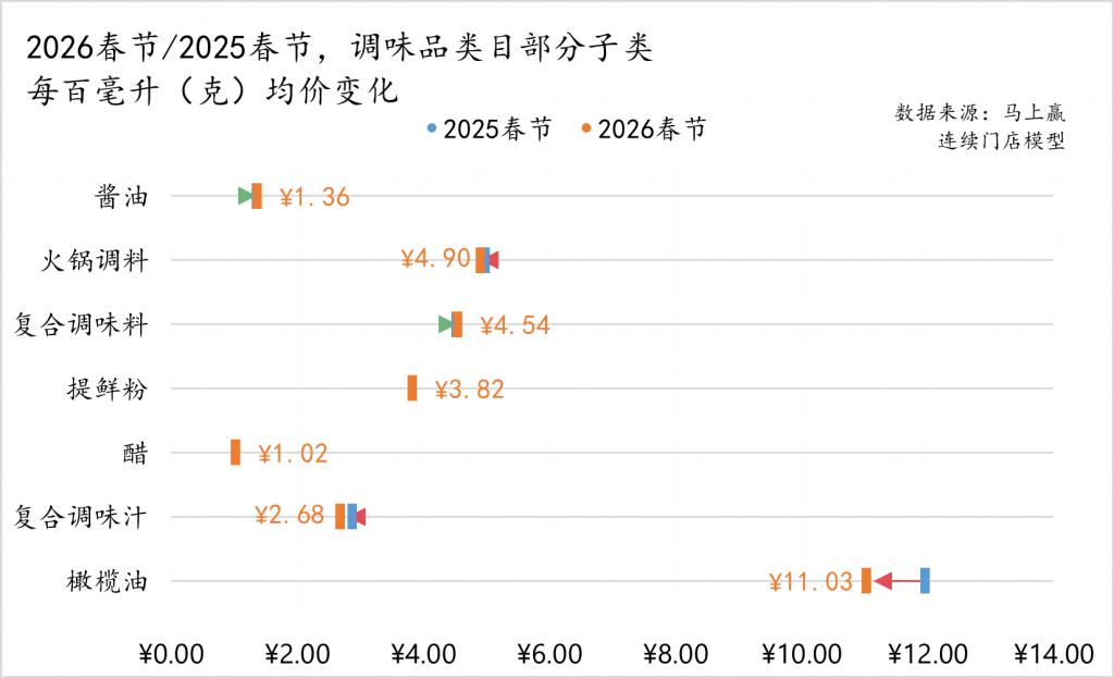 价格变化上,复合调味汁、火锅调料有小幅度的向下波动,但整体变化不大,其他类目同样有着极小幅度的波动;值得关注的同样是橄榄油,其每百毫升均价有着较为明显的下滑,推测或也与类目规模成长,消费者选择增加导致的市场竞争烈度与促销力度提升,参与竞争的品牌、产品增加有一定的相关性,2026年,橄榄油类目或将成为调味品类目中市场动作较为活跃的类目之一。
