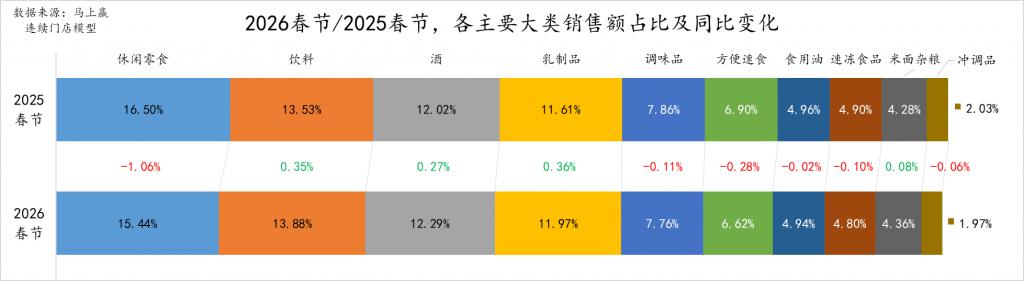 从2025、2026两年春节的占比变化上看,休闲零食的占比下滑最为明显,或与渠道碎片化、零食量贩业态进一步普及等有一定的关系,对传统线下零售业态中的该类目产品销售继续构成了一些影响;方便速食、调味品、速冻食品的占比也有小幅度的下滑;相比来说,饮料、酒、乳制品三个类目的占比有着较为明显的增长,意味着这些类目在传统线下零售中的重要性在提升。