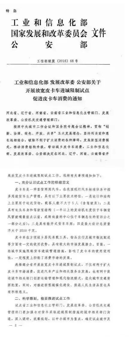 这份《关于开展放宽皮卡车进城限制试点促进皮卡车消费的通知》来看,工业和信息化部、发展改革委、公安部决定在河北省、辽宁省、河南省、云南省等省份开展放宽皮卡车进城限制试点工作,从而破除不利于扩大消费的各种障碍,发展新型消费模式,推动消费结构升级,带动城乡皮卡消费。试点方案应于2016年3月底前完成编制,报工业和信息化部、发展改革委、公安部备案。