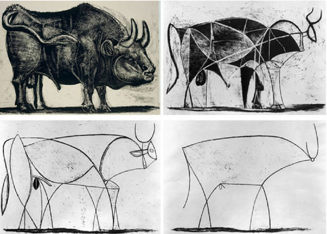 1945 年左右的毕加索开始尝试石版画,那时候的毕加索正是艺术成就上的成熟期,11 稿的《牛》反映的是一种去繁存简,做抽象减法的过程。画到最后一稿的时候,牛的细节已经缺失,但是我们仅从几笔线条中就能知道,毕加索所画的就是一头牛。