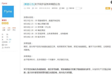 对此魅族官方回应,异常原因为“由于程序BUG,在多线程的一个场景中,标识错位引起。”并表示“期间,部分用户的同步数据如通话记录、短信等受到了影响,表现为数据错乱。基本不会对便签、云相册造成影响。”