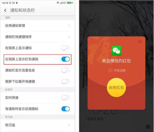 此外,360手机“一键抢红包”功能还有一个很人性化的亮点,那就是支持在锁屏和静音状态下进行提醒,前提是用户已在【通知和状态栏】中开启了【在锁屏上显示红包通知】选项。用户在得到红包通知后,无需解锁即可直接进入领取红包的界面。显然,这一特点,有助于用户在外出或有朋友来访、手机出于静默状态下也能及时地抢到红包。