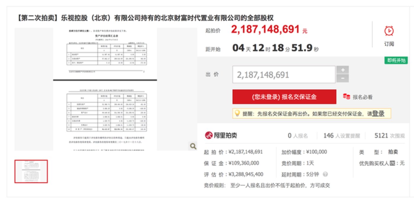 2019年1月,该项目便曾启动拍卖,但以流拍告终。北京市第三中级人民法院于2019年1月7日10点-1月8日10点,在北京市第三中级人民法院淘宝网司法拍卖网络平台上,公开拍卖乐视控股(北京)有限公司持有的北京财富时代置业有限公司全部股权。本次拍卖为首次拍卖,标的资产评估价为32.89亿元,起拍价为23.02亿元,保证金为1.15亿元,增价幅度为10万元。但是,截至1月8日10时,竞拍结束时,无一人报名参与竞拍。