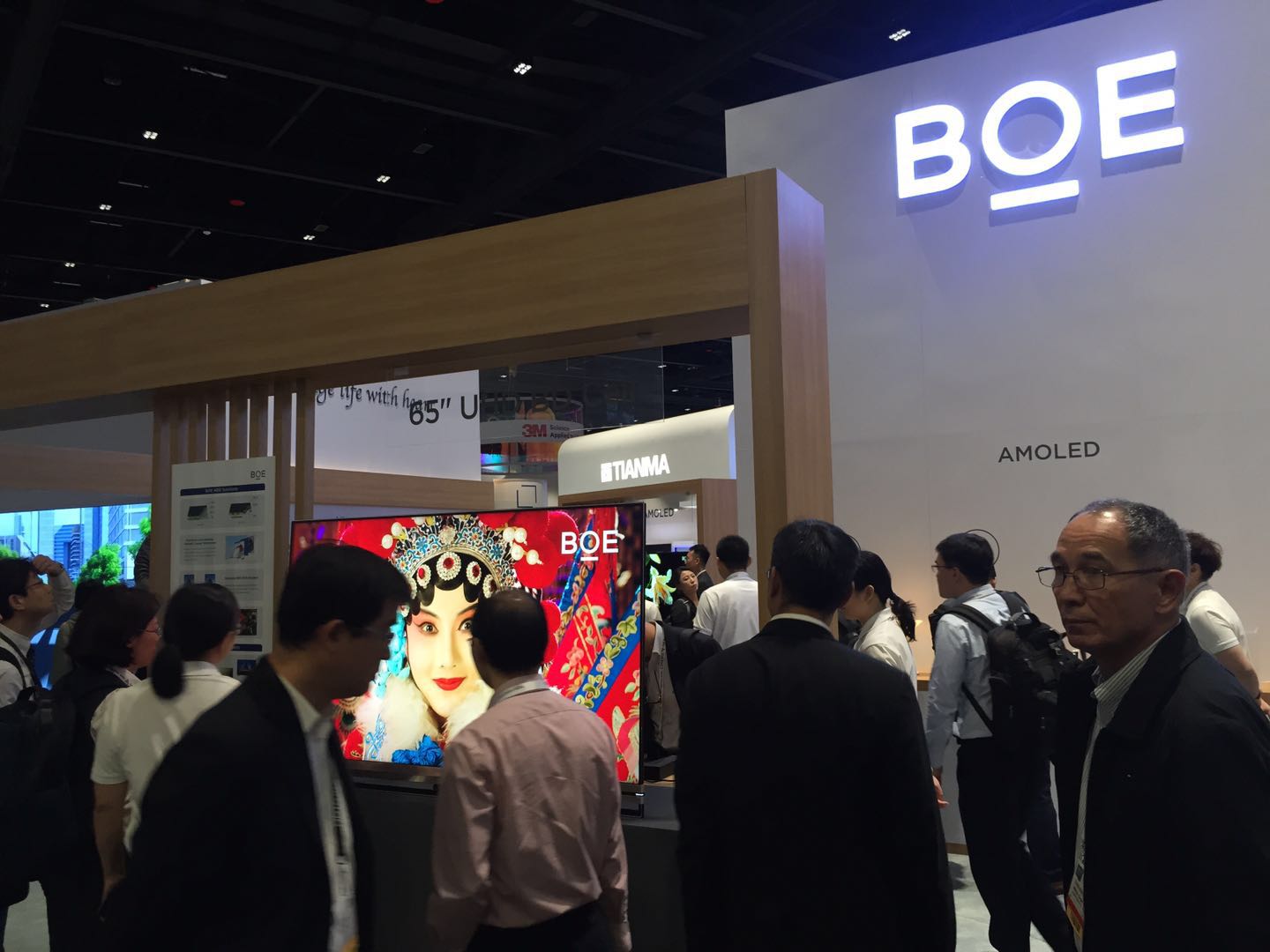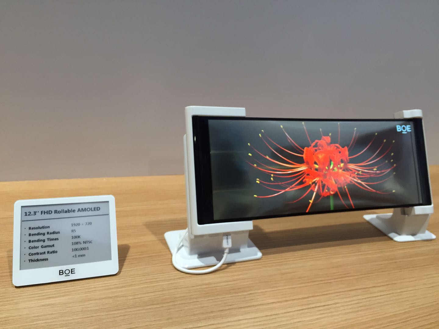 在2019 SID上,京东方展出了多款柔性AMOLED面板,包括用于车载的可卷曲AMOLED屏、用于移动产品的12.3英寸的可卷曲AMOLED屏;在大尺寸显示领域,则推出65英寸百万级超高对比度的BD CELL超高清液晶显示屏,黑色更黑,价格只是同尺寸OLED电视屏的约三分之二。