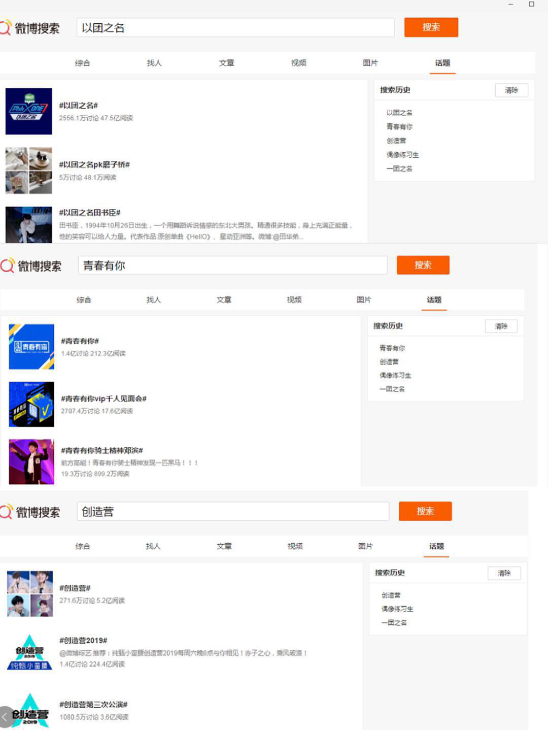 此外,虽说各大平台为防止数据造假关闭了前端的观看量,但微博作为偶像类养成节目的宣传阵地,其数据也能真实反映各家情况。据记者统计,优酷的《以团之名》在微博引发2556万讨论、47.5亿次阅读;相比之下,爱奇艺的《青春有你》在微博共计1.4亿讨论和212.3亿次阅读,腾讯视频的《创造营2019》在微博引发1.4亿讨论和224.4亿次阅读。