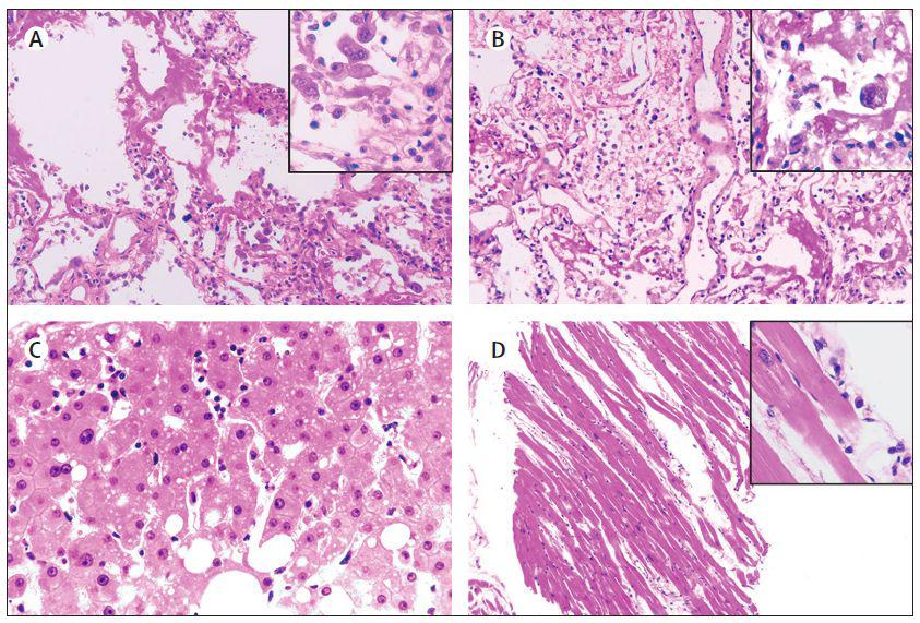 COVID-19 患者死后活检显微镜下所见,A-D 分别为右肺、左肺、肝、心肌 | 参考文献 [ 2 ]