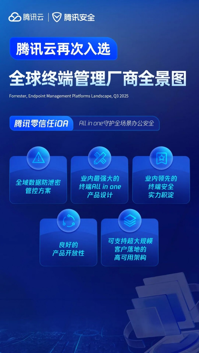 近日,国际权威机构Forrester发布“Endpoint Management Platforms Landscape, Q3 2025”报告(以下简称“报告”),并列举了全球35家终端管理平台代表供应商,腾讯云凭借零信任iOA入选报告,这是腾讯云连续第二年入选该系列报告。