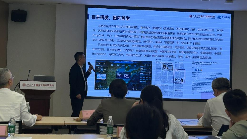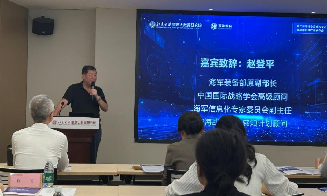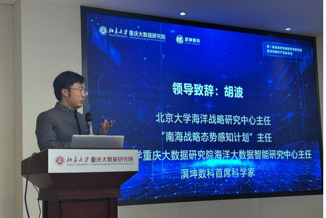 北京大学海洋战略研究中心主任、“南海战略态势感知计划”主任、溟坤数科首席科学家胡波首先介绍了北京大学重庆大数据研究院的成立背景和溟坤数科(重庆)智能科技有限公司的发展历程。他强调, 21世纪是海洋的世纪,保护和开发海洋的前提是要感知海洋,随着海洋议题越来越热,对海洋数据的需求也随之提升。“溟坤海域态势感知系统”长期专注于该领域的数据融合和人工智能应用,坚持数据源拓展和人工智能双轮驱动。他宣布,溟坤数科计划未来三年内重点推进电磁频谱星座研发与部署,通过构建覆盖更广、精度更高的空天数据获取网络,为全链条技术服务提供更坚实的数据支撑。最后,他呼吁,以行业会议、技术论坛等多元活动为纽带,积极推动高校、科研院所、企业及相关机构 协作,加速形成国内海域态势感知共同体,在核心技术突破、应用场景拓展等领域凝聚合力、贡献更多创新成果,助力国家在海域态势感知领域的学术研究与技术发展。