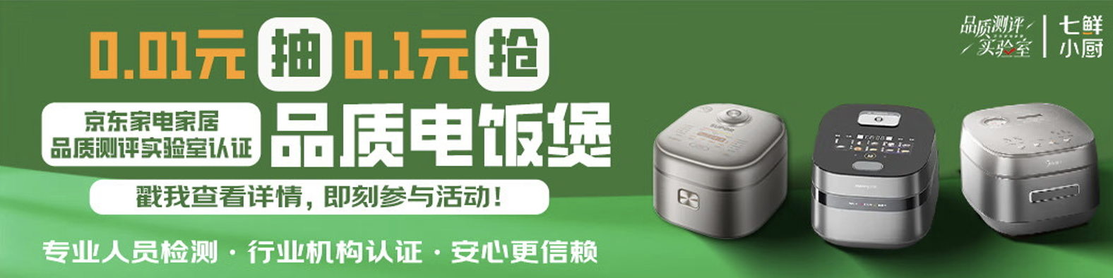 在快节奏的日常中,好好吃饭,既是对自己的温柔款待,也是对生活最真挚的热爱。为让更多消费者“吃一顿好饭”,京东家电家居品质检测实验室联合七鲜小厨,共同发起“送你一锅好饭”活动。10月20日18点起至10月23日,消费者在指定七鲜小厨门店下单外卖后,只需花0.01元即可参与秒杀,或参与刮刮乐抽奖,就有机会将经过京东家电家居品质检测实验室严格检测的品质电饭煲带回家,轻松升级厨房装备,让每一餐都吃得安心、吃得温暖。
