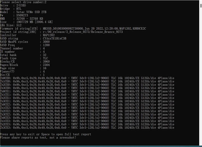 官方在电商平台并无展示采用的闪存颗粒是来自哪家,使用FlashID查询后得知,朗科 NV3000 2T采用的是YMTC的 3dv3-128L(x2-9060) TLC 16k 1024Gb/CE 512Gb/die 4Plane/die。YMTC也就是最近曝光率非常高的长江存储。