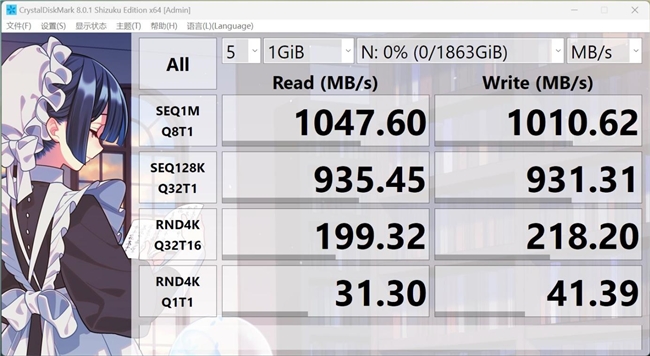 为了发挥朗科WH51最大性能,因此使用了主板的USB 3.1 Gen2接口进行测试。从测试结果来看,朗科WH51读写速度已经达到1000+MB/s。
