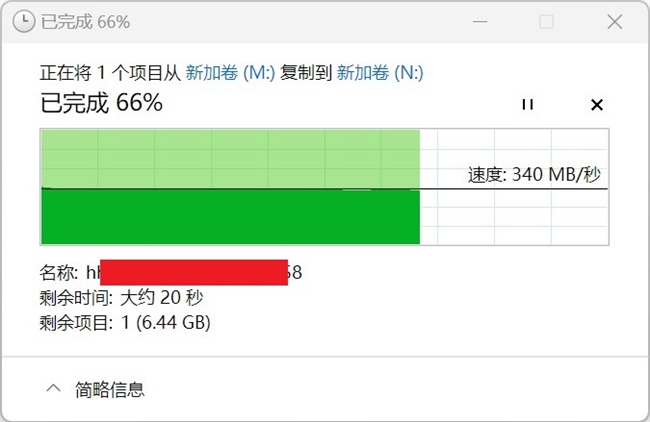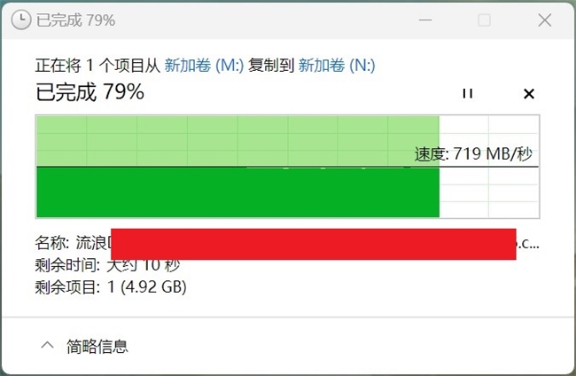 为了最大限度发挥朗科WH51,先将一个视频文件复制到本地的NVMe SSD,再将视频文件复制到朗科WH51。复制一个20G大小的视频文件,写入速度基本上保持在700+MB/s,这样的写入速度已经是非常高级的写入速度了。