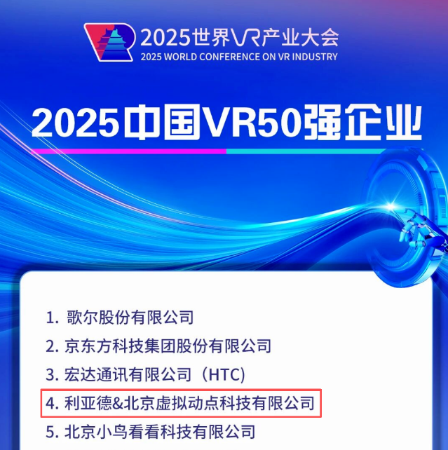 10月19日,“2025中国VR50强企业”名单正式发布,利亚德及旗下虚拟动点表现卓越,连续5年荣耀上榜,稳居第四位,彰显了其在产业内的领先地位和强大实力。