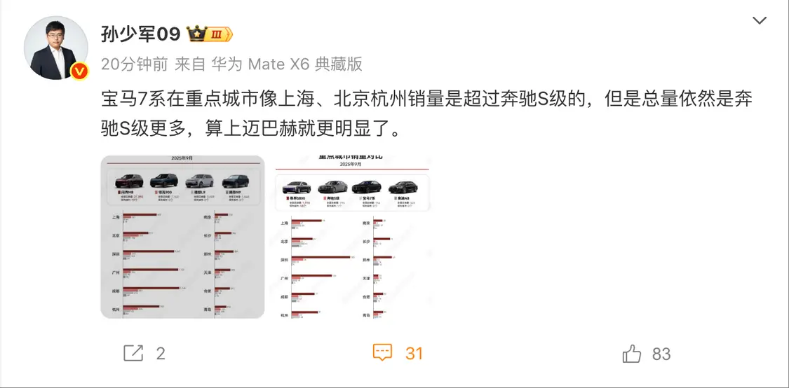 该博主还称:“宝马7系在重点城市像上海、北京杭州销量是超过奔驰S级的,但是总量依然是奔驰S级更多。”
