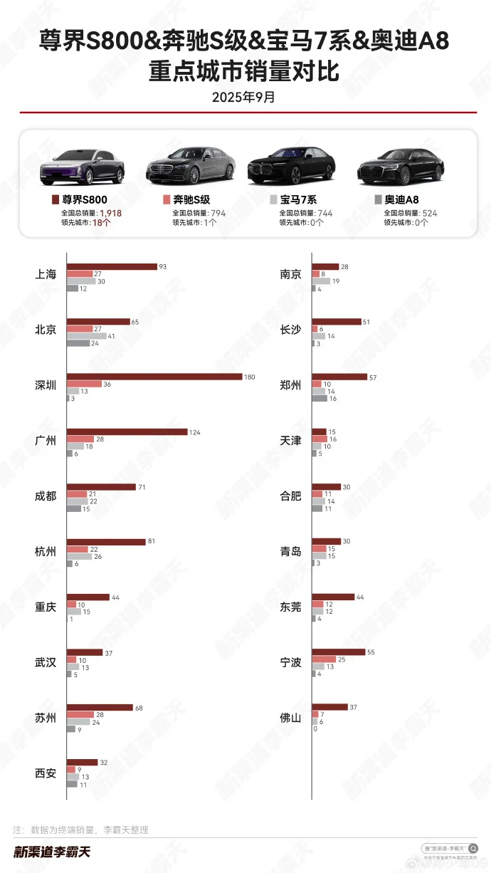 10月21日, 博主“孙少军09”分享了一张尊界S800、奔驰s级、宝马7系、奥迪A8重点城市9月销量对比数据图。根据图中的信息,9月,尊界S800销量前五的城市分别是深圳(180) 、广州(124)、上海(93),杭州(81)、苏州(68),值得注意的是,北京销量为65台,排在第6位,销量前5的城市均位于南方。