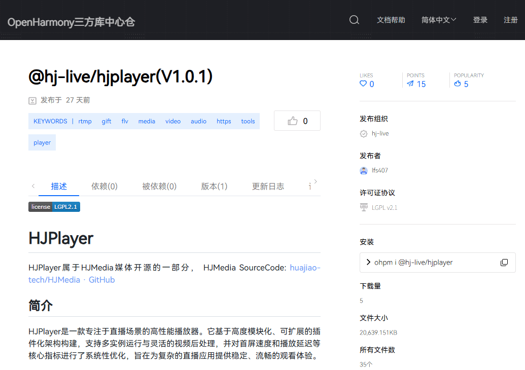 登录“OpenHarmony”官网,点击“开发者”—>“OpenHarmony三方库中心仓”,搜索“hj-live/hjplayer”即可获取相关资源。