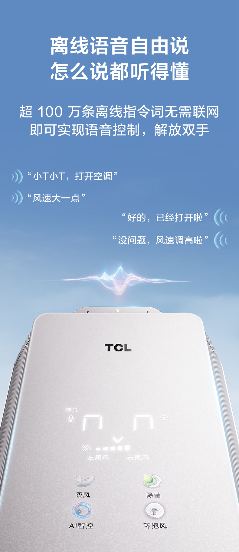 在实际操作中,TCL小蓝翼P6 Plus AI健康空调拥有第二代离线语音自由说,搭载超100万条离线指令词,可实现语音控制,只需喊出“小T小T”即可唤醒空调,进行调控,解放双手。同时,还能根据声音精准识别人体位置,实现“风向人吹”或“风避人吹”。即使是家中的老人也能快速上手,无需复杂的操作步骤。